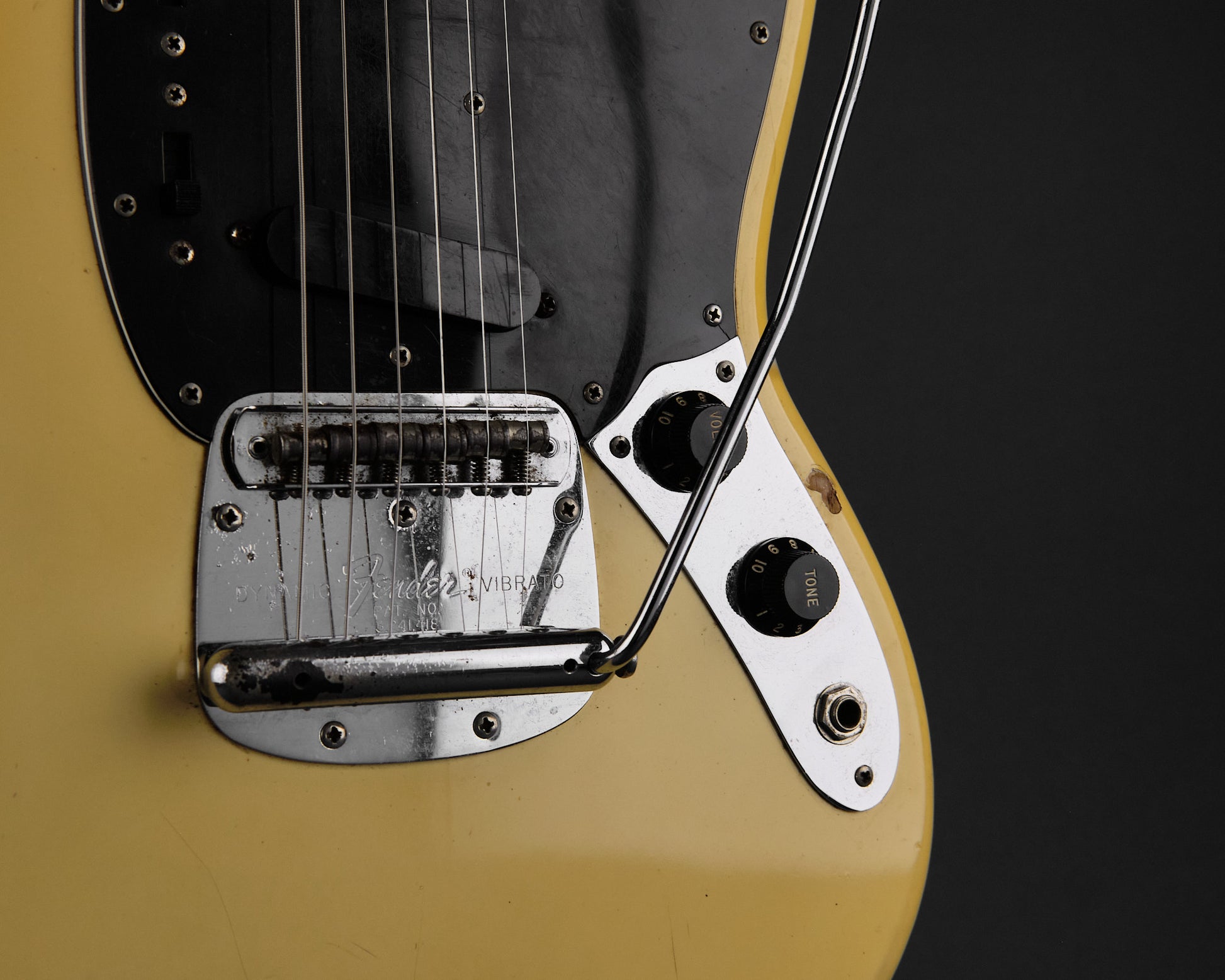 The original finish has now yellowed and has taken on an almost banana like tone. The frets appear original as does the wiring, pickups, and pots. Some foam has been added in one of the cavities as well as a screw added into the tremolo system, but besides that this is a great example with plenty of mojo and character.